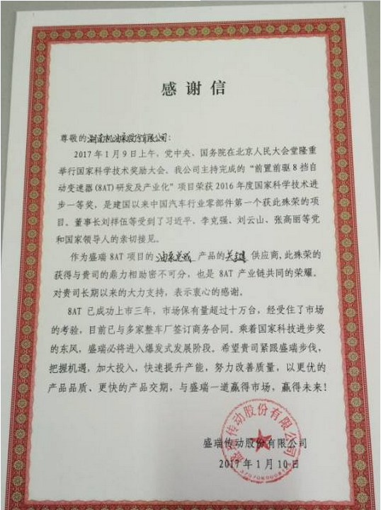 盛瑞傳動“8AT變速箱泵”創新結構設計,采用油泵與變速器的定位銷與外圓新型安裝方法,減小了壓力脈沖幅值、降低運行噪音、降低了裝配成本。技術處于國際先進水平,為其配套生產的8AT自動變速器研發及產業化項目榮獲國家科技進步一等獎。