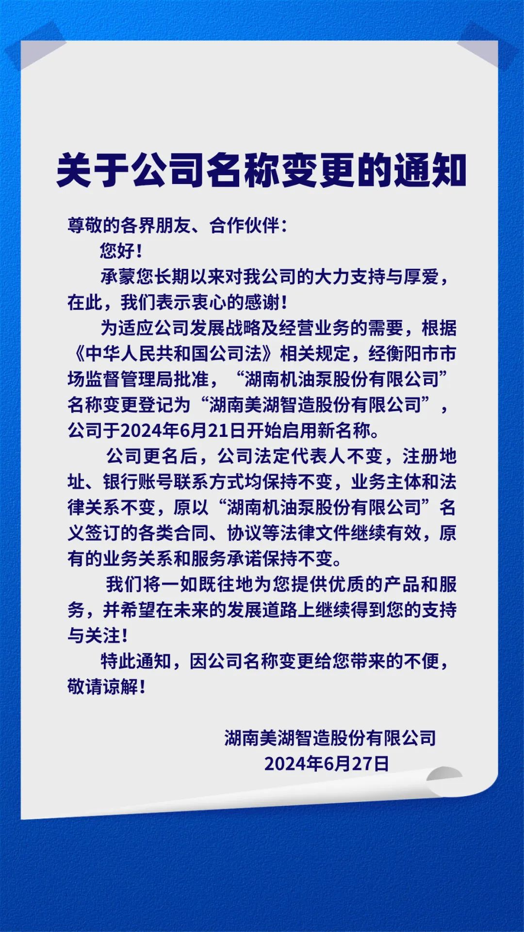 湖南機(jī)油泵股份有限公司變更為湖南美湖智造股份有限公司的通知