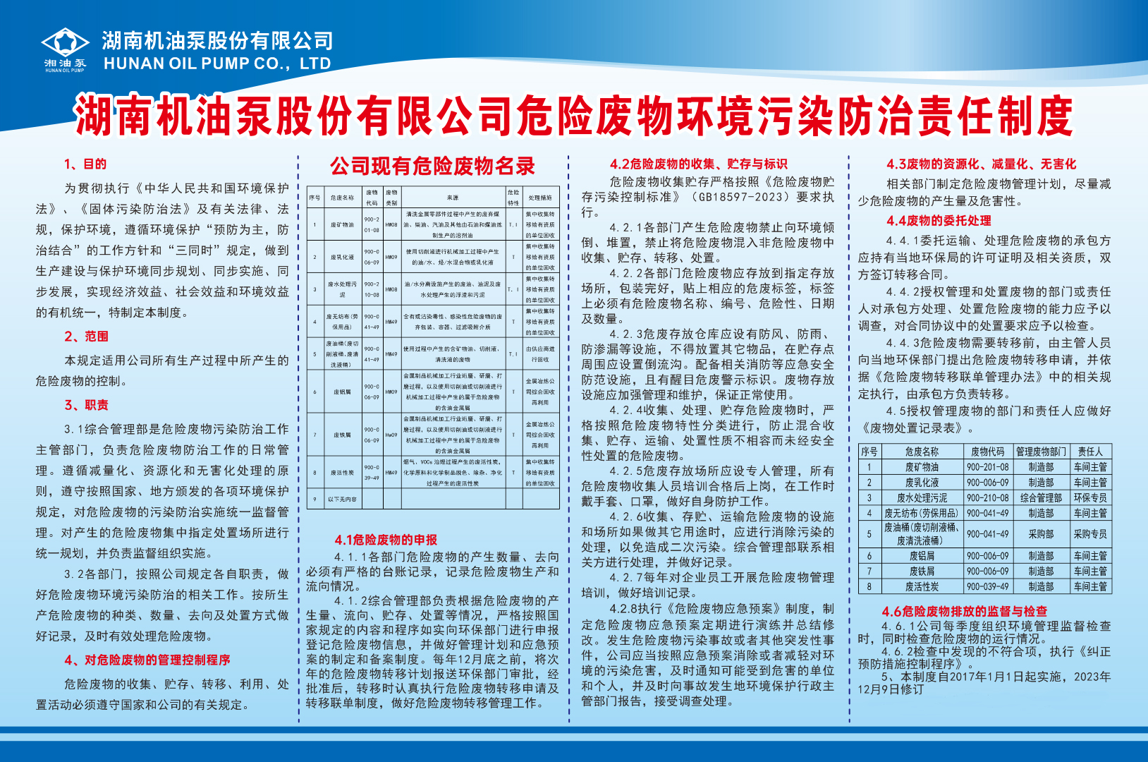 湖南機油泵股份有限公司危險廢物環(huán)境污染防治責任制度